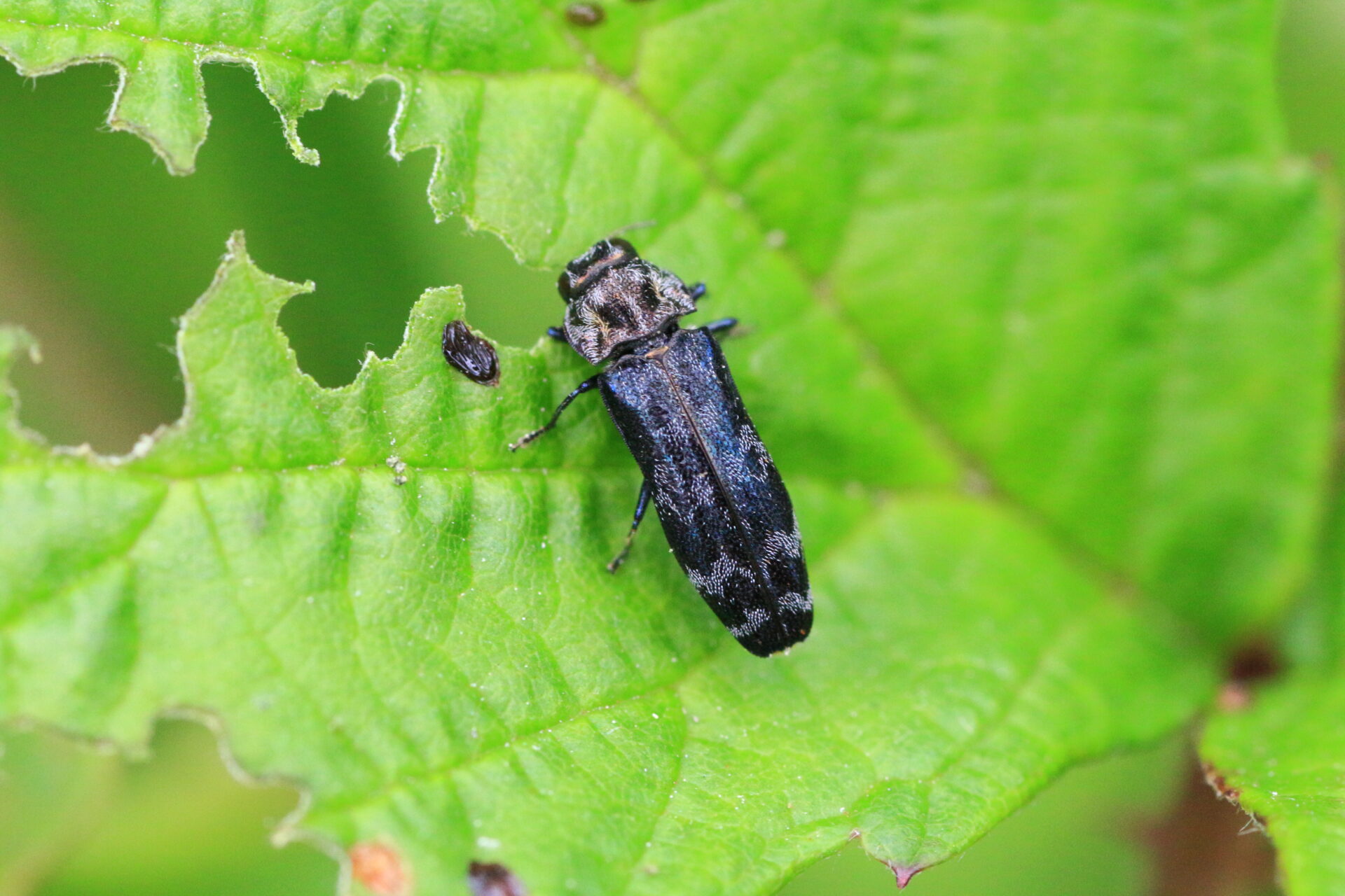Fig. 3. An adult of Coraebus sakagutii sakagutii Y. Kurosawa, 1963 feeding a leaf of Rubus parvifolius which is their host plant.